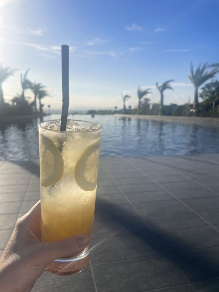 後ろのプールバーには種類豊富なドリンクが揃い、プールサイドで楽しむことができます🍹
