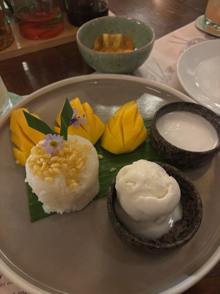 マンゴーを甘いもち米やアイス、ココナッツミルクと食べるデザートです。