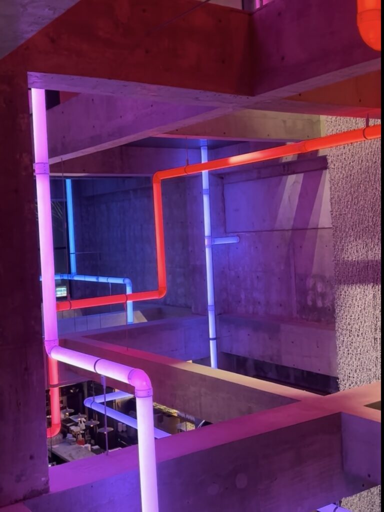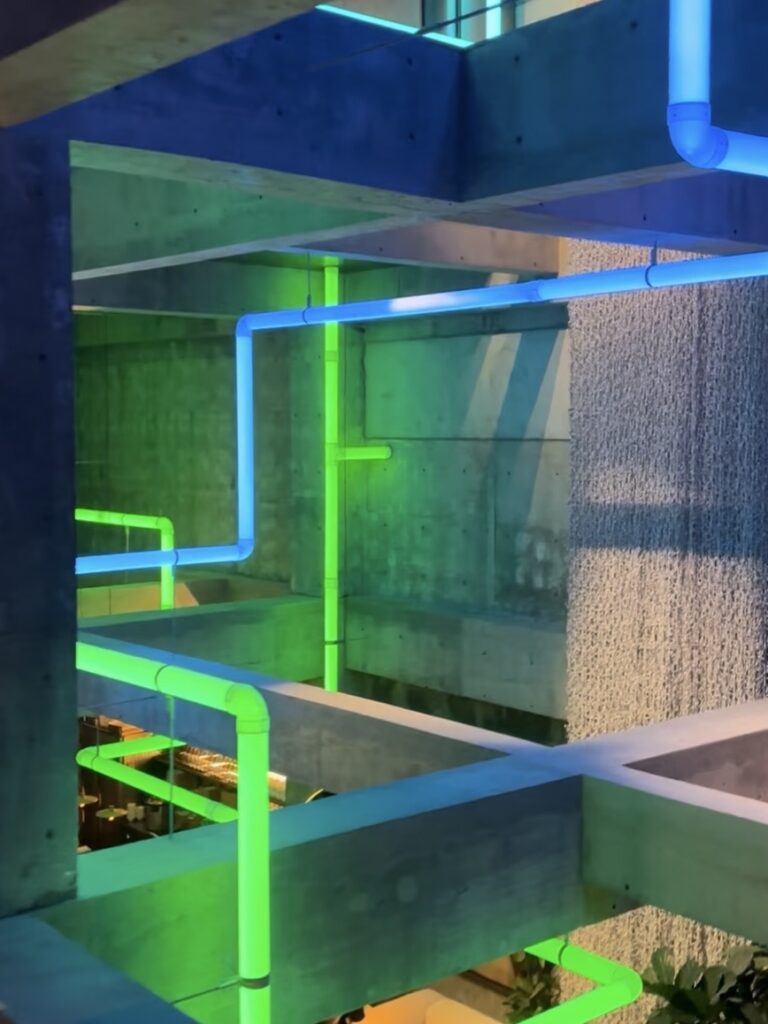 この光るパイプは現代アーティストのレアンドロ・エルリッヒという人の作品。