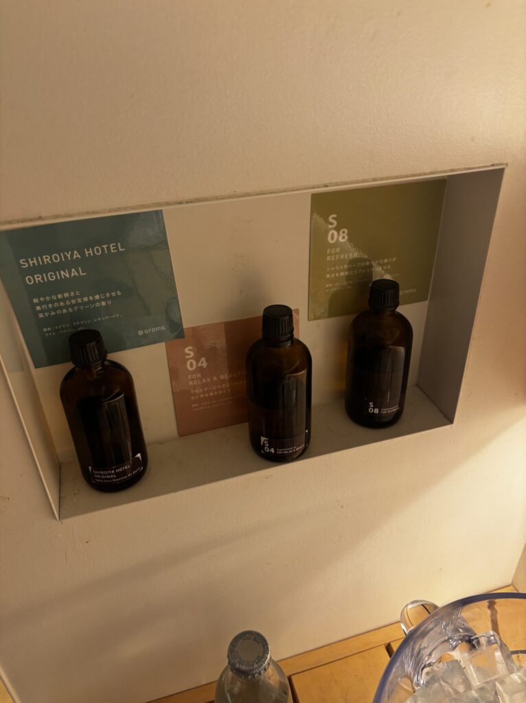 ロウリュウに使えるアロマオイルは3種類あって、1つはSHIROIYA HOTELのオリジナルです。